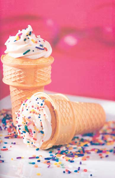 Fill muffin pan with flat-bottomed ice cream cones. Fill each cone three-quarters full of cake batter. Bake in preheated oven for 25 to 30 minutes or until tops of cupcakes are golden brown and a tester inserted in center comes out clean. Let cool completely in pan on rack.