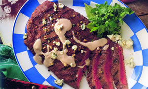 Cut the steak on the diagonal, across the grain, into 1/4-inch slices and arrange them on a platter. Top with the sauce and garnish with watercress and remaining cheese.