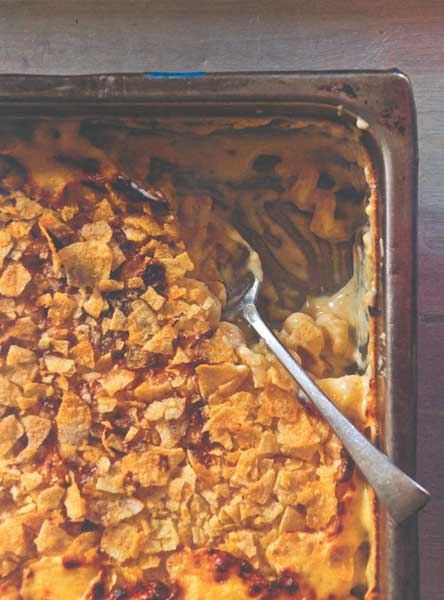 In a Dutch oven, heat the cream to a simmer over medium-high heat. Turn the heat down to low, add the Velveeta, and stir until it melts. Add the sausage, cheddar and Parrano, stirring until the cheese is completely melted. Pull the pot from the heat and fold in the cooked pasta. Pour the pasta into the baking dish and top with the crumbled potato chips.