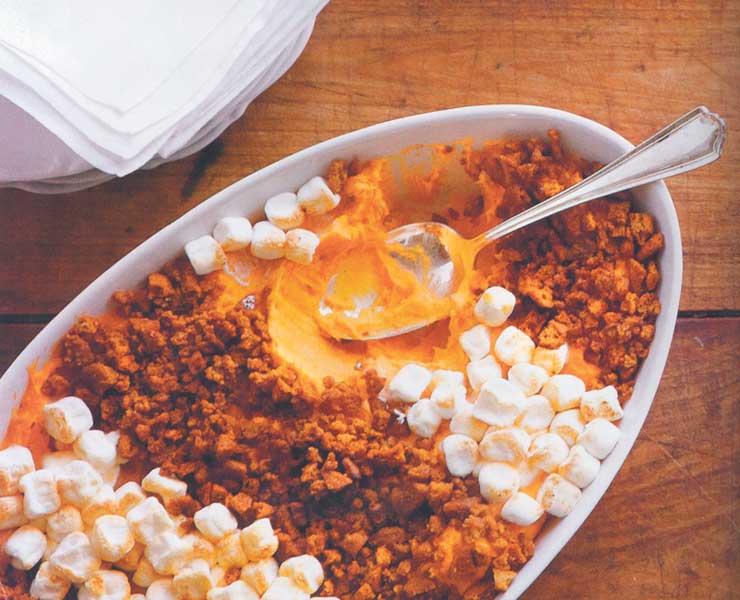 Stir remaining 1/4 cup melted butter into crushed gingersnaps. Top potato mixture with marshmallows and the gingersnap mixture in alternating crosswise rows.