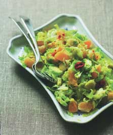 Remove the outer leaves from the Brussels sprouts and cut off the bases. Cut them into very thin slices. Rinse and let drain in a colander.