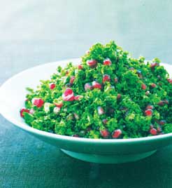 Rinse the kale in cold water, then squeeze to remove the water. Shred the leaves finely. Cut the pomegranates in half and release the kernels and juice, discarding any white, pithy membrane. Mix the kale into the pomegranate kernels and juice. Mix the ingredients for the dressing and toss with the salad, seasoning to taste.