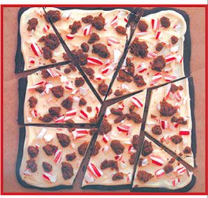 Repeat with white chocolate chips. Before the white chocolate layer sets, sprinkle crushed candy and gingerbread dough crumbles on top; press to adhere. Chill until set, 10 to 15 minutes, then break or cut bark into pieces. Refrigerate until ready to eat.