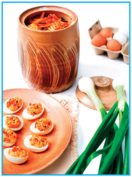 5. Just before serving, garnish the deviled eggs with sprinklings of thinly sliced scallion and a light scattering of black sesame seeds. Arrange on a large pottery platter (Julie uses one of her own), then if you like, cluster thin scallion sticks in the center of the platter.