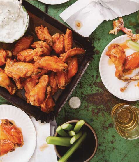 Remove the wings from the oven, add them to the sauce, and gently toss until fully coated. Serve with the blue cheese dip and celery sticks.