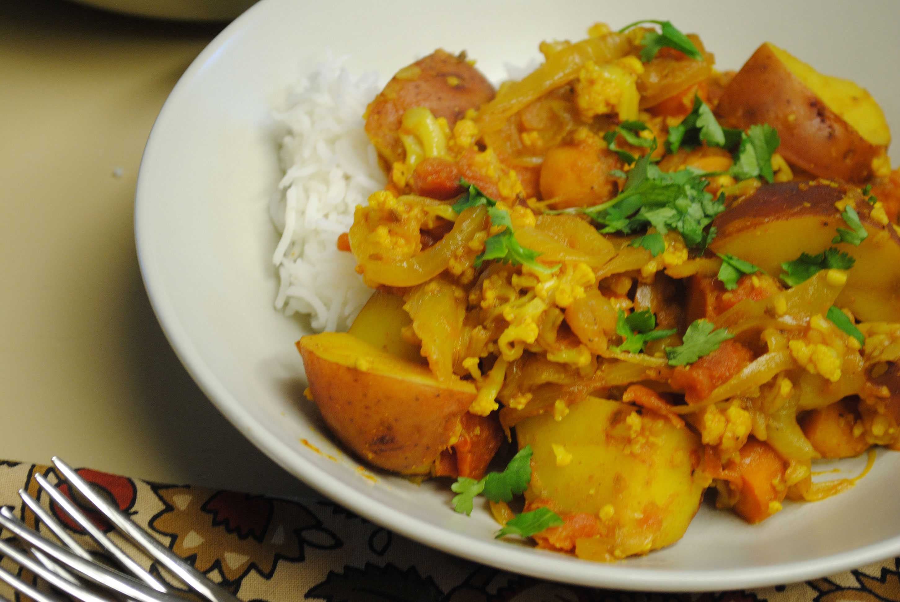 Add the potatoes and cauliflower to the pan and stir well to coat with the spices. Cook until potatoes are cooked through, stirring to prevent burning and sprinkling with a little water if it becomes too dry. Add salt to taste.