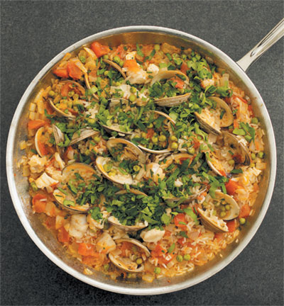 Notes: Discard any clams that don't open after the cooking time. The crust that may form on the bottom of the paella, called "socarrat" in Spanish, is prized. If you smell a toasty but not burned aroma and feel a little gritty resistance when you poke the mixture gently with a spoon near the end of the cooking time, you have it. The "socarrat" adds a smoky note to the dish.