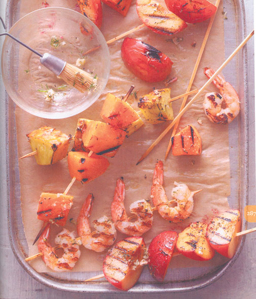For a charcoal grill, grill skewers on the rack of an uncovered grill directly over medium-heat coals for 5 to 8 minutes or until shrimp are opaque and fruit is heated through, turning occasionally during grilling and brushing once with the remaining lemon juice mixture halfway through grilling. (For a gas grill, preheat grill. Reduce heat to medium. Place skewers on grill rack over heat. Cover and grill as above.)