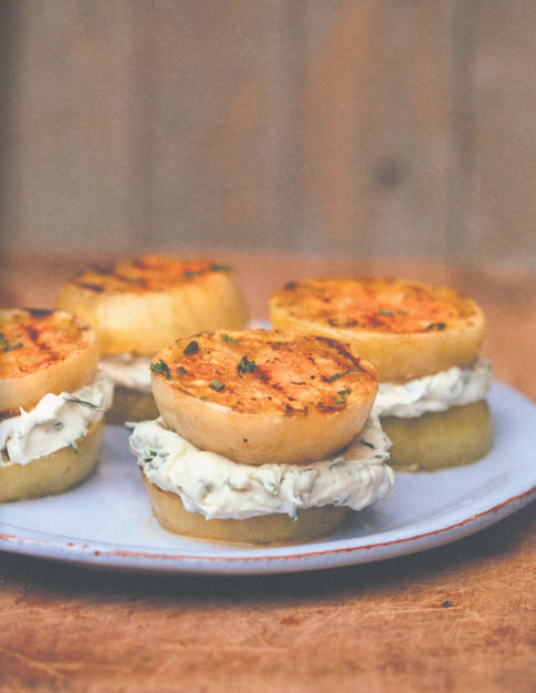 Grilled Green Tomato "Sandwiches" With Herbed Cream Cheese