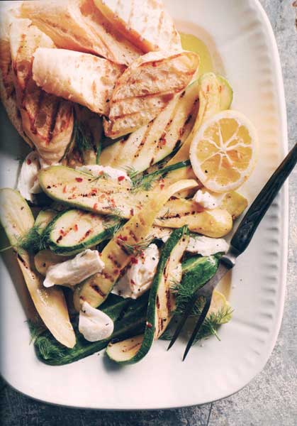 On a serving platter, arrange warm zucchini and mozzarella. Sprinkle with dill and crushed red pepper.