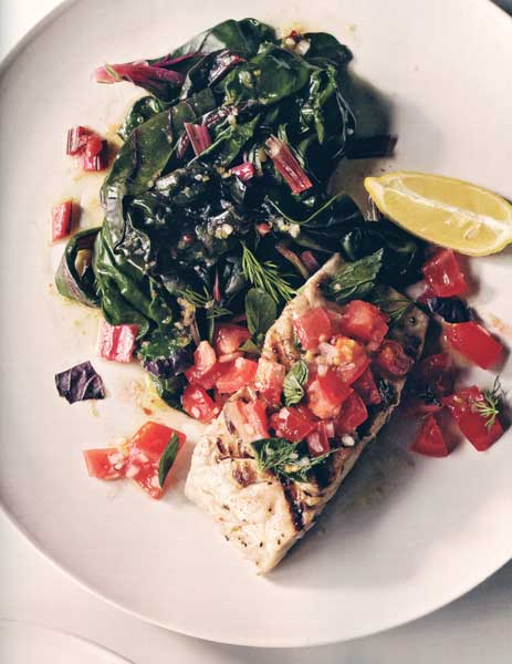 Grilled Skin-on Striped Bass with Summer Tomatoes and Horta (Greens)