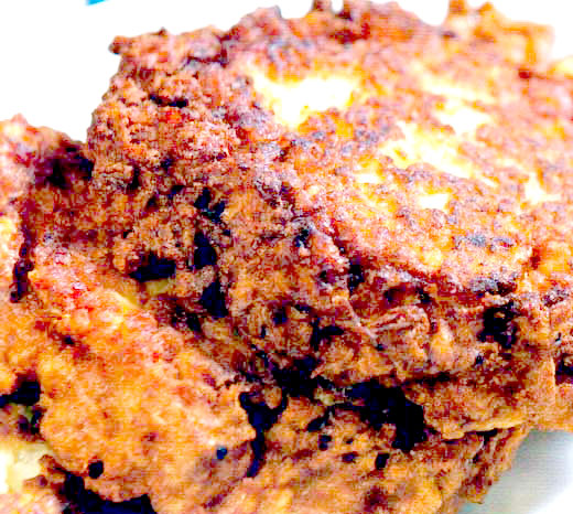 Drop latke batter by 1/4-cup ladles or large spoon carefully into the frying pan. Fry on one side until edges are crispy and golden, about 3 minutes. Turn once and fry until cooked through and crispy on the other side. Transfer latkes to a paper towel-lined plate and repeat using remaining batter, adding more oil if necessary.