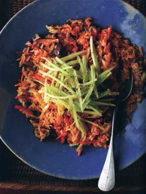 Serve on a bed of the remaining 1–1/2 cups of rice.