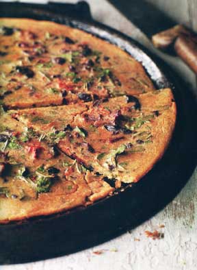 Variation: Omit the olives and tomatoes from the batter and spread the baked farinata with a thin layer of pesto.