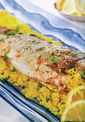 Bake for 1 hour or until the fish is tender. (Test by gently inserting a fork into the flesh, which should begin to flake.) Unwrap the foil packages and place the fish on a large serving platter. Garnish with lemon wedges.