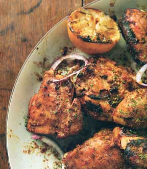 Place the marinated pieces of chicken on the grill and cook, turning once to ensure even cooking, for up to 1 hour, until cooked through and the chicken reaches an internal temperature of 165 degrees. Your cooking time may differ, depending on your grill and how well done you prefer the chicken to be. We prefer it well done. Remove from the grill and transfer to a serving platter.
