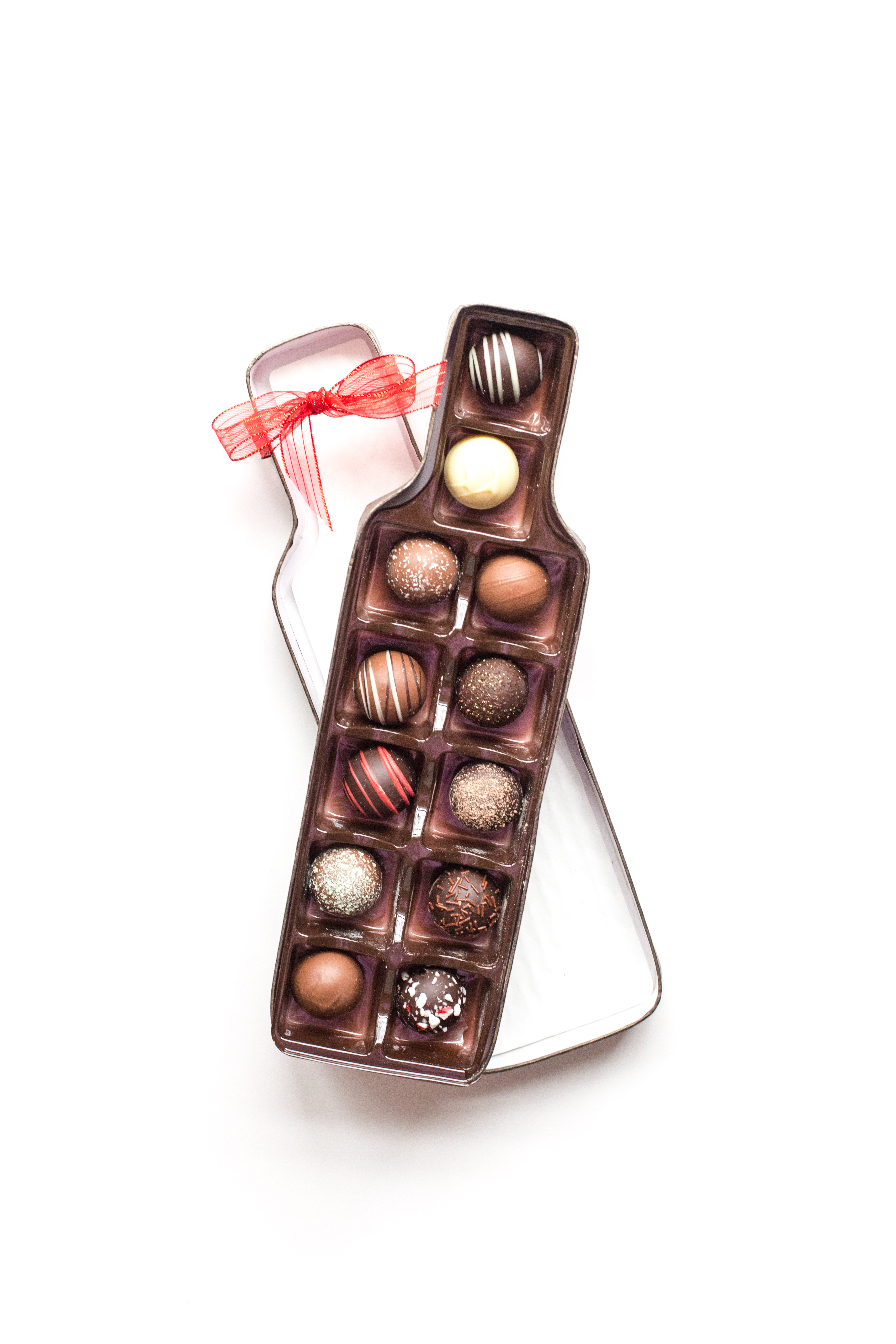Sugar Plum Wine Box Truffle Assortment – A 12-piece selection of handcrafted chocolate truffles is decadently laid out in a wine bottle-shaped box. $35 Sugar-plum.com