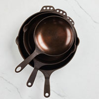 The Founder's 3-Piece Set – As beautiful as it is functional, this collection includes the first three cast iron skillets with which Smithey was founded: No. 8 Chef, No. 10 Traditional and No. 12 Traditional. $399 Smithey.com