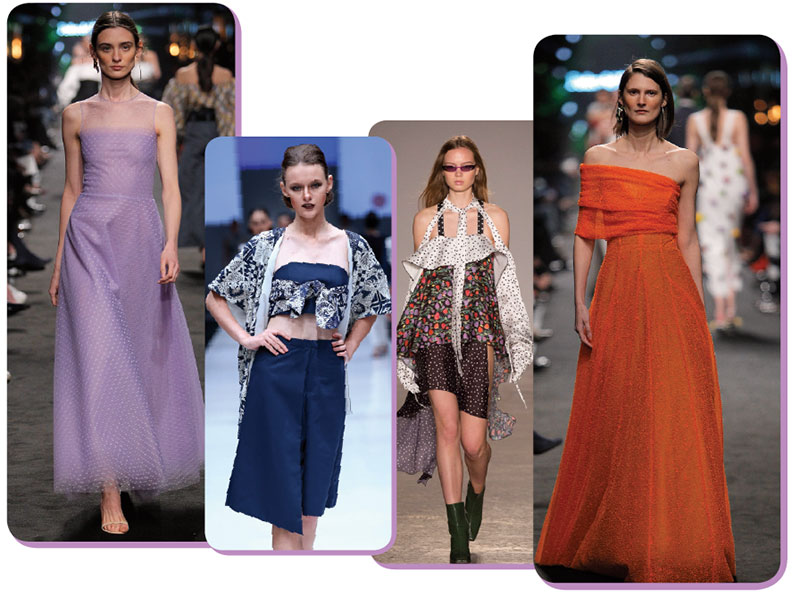 Whether you browse North Hills or Southpoint, you'll see an eclectic mix of garments on the racks this season. Here are more fresh takes: glitzy sequins; sporty accents; puff sleeves; slip dresses; flowy frocks; asymmetrical necklines; flared pants; handkerchief hems; decorative straps; tiered skirts; prominent logos; track pants; punk designs; and both '60s and '80s throwbacks.