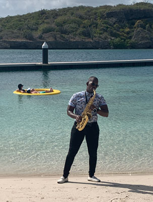 A saxophonist, his white pants rolled up to reveal bare feet, strolled along the coastline at the exact spot where water laps against sand. Channeling Kenny G. and John Coltrane, he blew smooth, rich, powerful notes that drifted over the beach.
