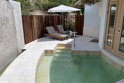 At Coral Estate’s hotel, we occupied a lovely room with an ocean view as well as a fully stocked kitchenette and a large, well-equipped patio just steps from a VIP plunge pool.