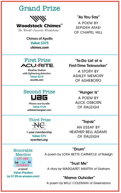 "Thanks for inspiring readers to become writers," said a Chapel Hill resident in a note with her short-story entry in the 2017 Carolina Woman Writing Contest. It's a mutual admiration society! Thanks to all of you for submitting your work. Congratulations to everyone - from newbies to prize-winning scribes - who sent in fiction, nonfiction and poetry. In my opinion, just keeping your pen moving makes you a champion.