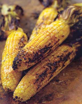 Oil the grill grate well and spread the olive oil over the ears of corn. Arrange the corn on the grate and grill, turning the ears, until they have nice grill marks, about 3 minutes.