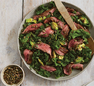 4. Portion the salad onto serving plates, add the remaining avocado cubes, topping them with pumpkin seeds and coriander. Season the steak with a sprinkle of salt, slice against the grain, and distribute on the salad plates, finishing with pepper.