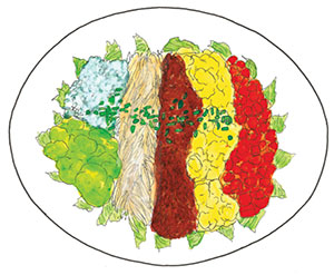 Cut finely the lettuce, watercress, chicory and romaine and arrange in a salad bowl. Cut the tomatoes in half, remove the seeds, dice finely and arrange over the top of the chopped greens (salad leaves).