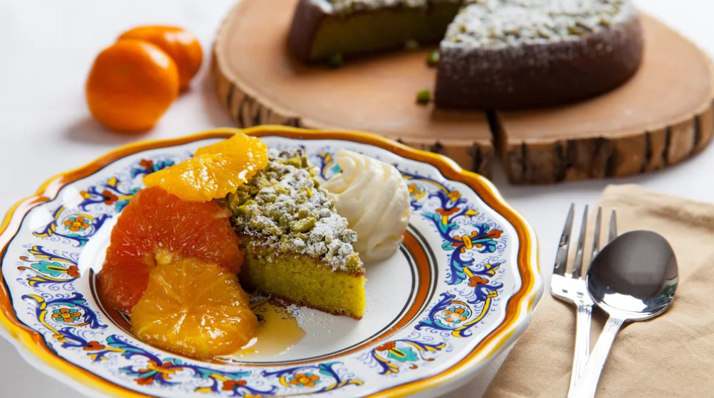 Top cake with the chopped pistachios and dust with confectioners’ sugar. Serve with a side dollop of panna acida and honeyed oranges.