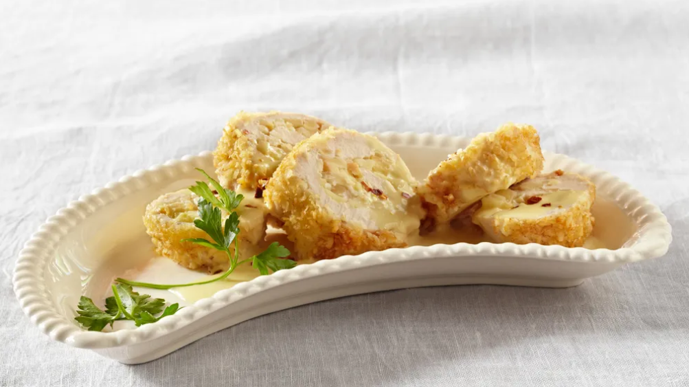 Pour a little sauce on each plate, slice the breasts diagonally and arrange on sauce. Garnish with red pepper flakes and parsley; serve immediately.